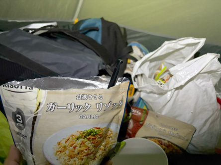 朝:機内食x3と空港のモンゴリアン丼、夜:モンベルのガーリックリゾッタ。